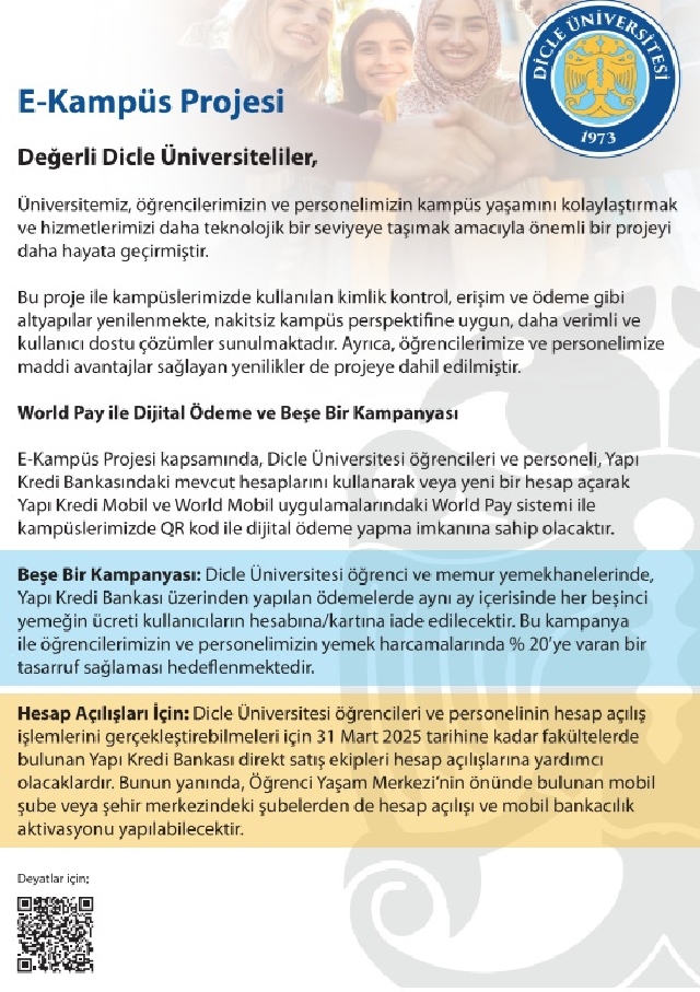 Dicle Üniversitesi; öğrencilerimizin ve personelimizin kampüs yaşamını kolaylaştırmak ve hizmetleri daha teknolojik bir seviyeye taşımak amacıyla E-Kampüs Projesi'ni hayata geçirmiştir. Proje ile ilgili detaylara şuradan ulaşılabilir: