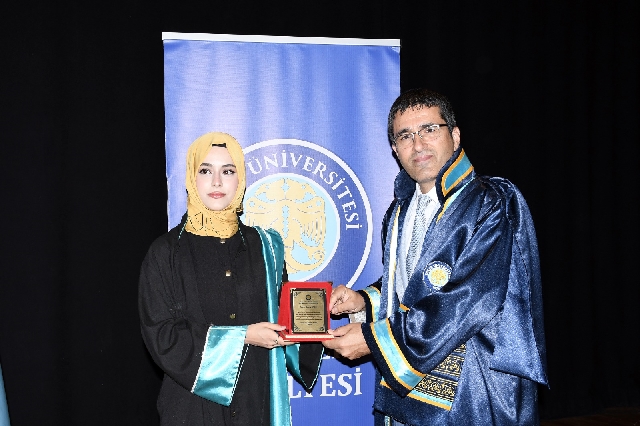 Tören, fakülte birincisinin mezuniyet kütüğüne ismini çakması, dereceye giren öğrencilere plaket ve başarı belgelerinin takdimi ile devam etti. Program, öğrencilerin büyük bir coşku içinde keplerini havaya atmasıyla sona erdi.