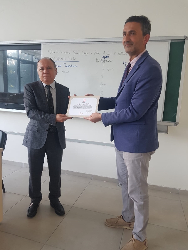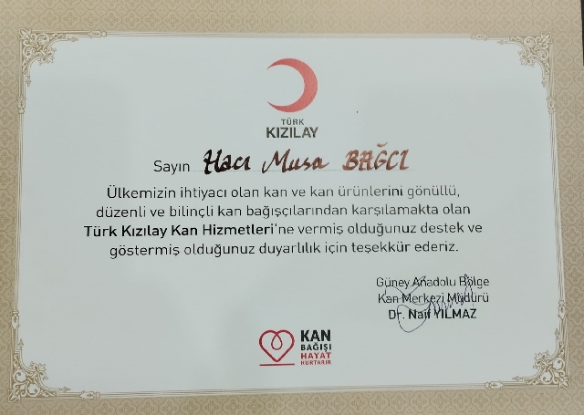 Fakültemizde Kızılay kan merkezine öğrencilerimiz ve öğretim elemanlarımızın yapmış olduğu destek ve göstermiş oldukları duyarlılık için Güneydoğu Anadolu Bölge Kan Merkezi Müdürü Dr. Naif Yılmaz tarafından Dekanımız Prof. Dr. H. Musa BAĞCI'ya teşekkür belgesi verildi.