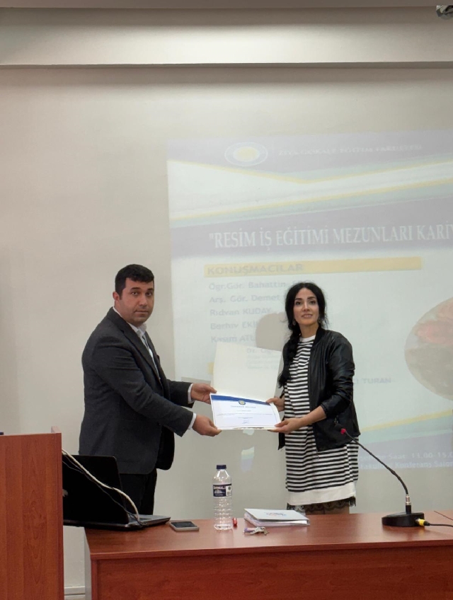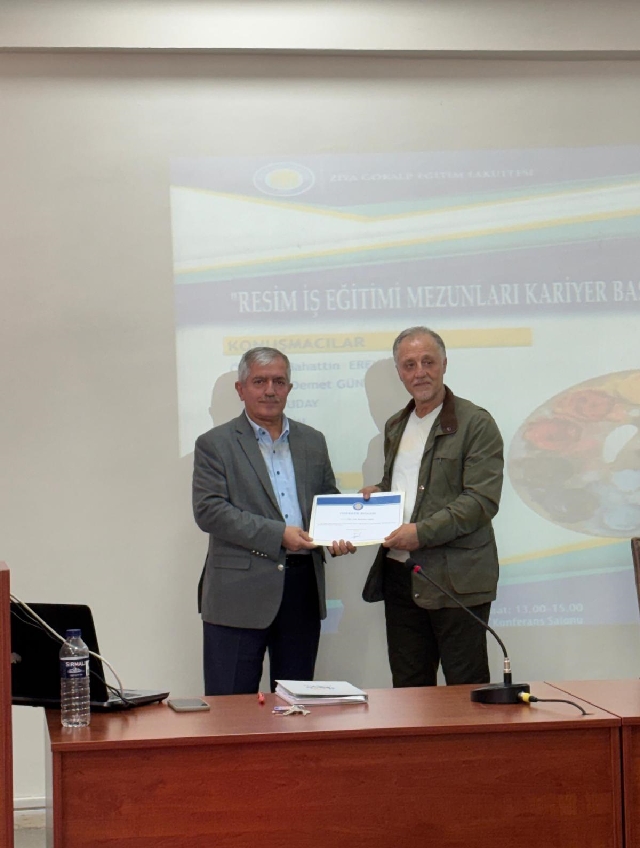 30 Ekim 2025 saat 13:00-15:00 saatleri arasında Ziya Gökalp Eğitim Fakültesi Konferans Salonda Resim İş Eğitimi Anabilim Dalı tarafından "Resim İş Eğitimi Mezunları Kariyer Basamakları" başlıklı bir söyleşi düzenlendi. Moderatörlüğünü Dr.Öğr.Üyesi Münire Meral YAĞÇI TURAN'IN yaptığı söyleşide Resim İş Eğitimi Anabilim Dalının ilk mezunlarindan olan ve Resim İş Eğitimi Anabilim Dalında görev yapan Ögr.Gör. Bahattin EREN, Arş.Gör Demet GÜNEŞ, Sanatçı-Galerici Rıdvan Kuday, Sanatçı-Ögretmen Berhiv EKİN, Sanatçı-Ögretmen Kasım ATLI sanata ve sanat eğitimine olan ilginin nasıl başladığına, okudukları bölümü seçerken yaşadıkları olumlu ve olumsuz süreçlere , bölümü okudukları süreçteki tecrübelerine,mezun olduktan sonra alanları ile ilgili yönelimlerine ve tecrübelerine, kariyerleri ile ilgili koydukları hedeflere, hedeflerine doğru yürürken kullandıkları yöntemlere değindiler. Resim İş Öğretmenliği lisans programında öğrenim gören öğrenciler, mezunlara mesleki gelisimleri ve kariyer süreçleri hakkında sorular yönelttiler. Söyleşi sonunda katılımcılara teşekkür belgesi takdimi yapıldı .