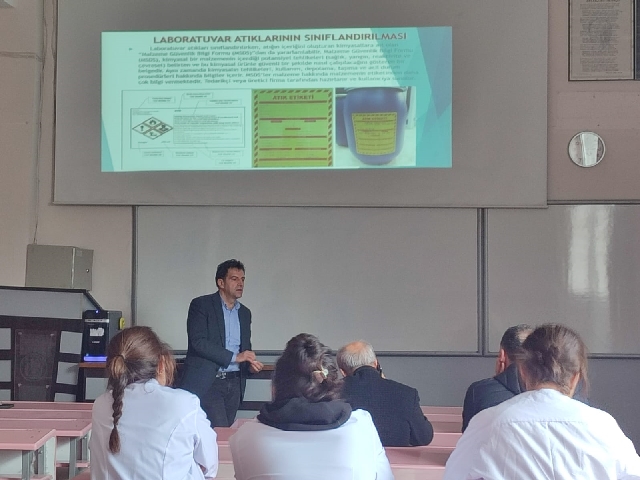 Dicle Üniversitesi Fen Fakültesi akademisyenleri, öğrencileri ve çalışanlarına Çevre Yönetimi ve Sıfır Atık Koordinatörümüz Oğuzhan Eyigün tarafından tehlikeli  atıkların tanımı, sınıflandırılması, depolanması, bertaraf edilmesi ve tehlikeli atıklarla çalışma esasları hakkında bilgilendirmeler yapıldı.