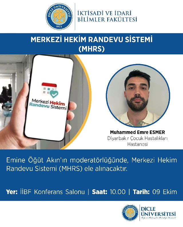 Diyarbakır Çocuk Hastalıkları Hastanesi'nde görev yapmakta olan Muhammed Emre Esmer, Merkezi Hekim Randevu Sistemi (MHRS) hakkında bilgilendirici bir sunum gerçekleştirecektir.