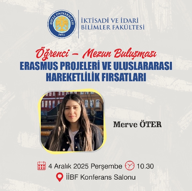 Erasmus öğrenim ve staj hareketlilikleri kapsamında edindiği deneyimleri, proje yazımı ve başvuru süreçlerine dair ipuçlarını paylaşmak üzere üniversitemize konuk oluyor. Yurt dışında eğitim alma, kültürlerarası etkileşim kurma ve kişisel–akademik gelişim sağlama olanaklarını merak eden tüm öğrenciler için ilham verici bir buluşma sizleri bekliyor.