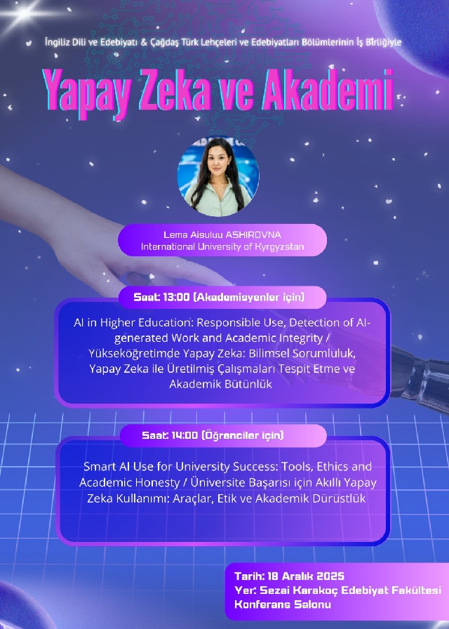 18 Aralık 2025 Perşembe günü Sezai Karakoç Edebiyat Fakültesi Konferans Salonunda Uluslararası Kırgızistan Üniversitesi’nden gelen konuk konuşmacı Lema Aisuluu ASHIROVNA, Akademisyenler için 13:00’te “AI in Higher Education: Responsible Use, Detection of AI-generated Work and Academic Integrity / Yükseköğretimde Yapay Zeka: Bilimsel Sorumluluk, Yapay Zeka ile Üretilmiş Çalışmaları Tespit Etme ve Akademik Bütünlük”, öğrenciler için 14:00’te “Smart AI Use for University Success: Tools, Ethics and Academic Honesty / Üniversite Başarısı için Akıllı Yapay Zeka Kullanımı: Araçlar, Etik ve Akademik Dürüstlük” isimli sunumları gerçekleştirecektir. İngiliz Dili ve Edebiyatı ile Çağdaş Türk Lehçeleri ve Edebiyatları Bölümlerinin iş birliğiyle gerçekleşen bu etkinliğimize tüm fakülte akademisyenlerimizi ve öğrencilerimizi ilgili saatlerde bekleriz.