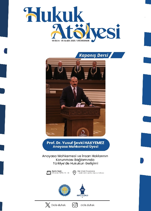 Dicle Üniversitesi Düşünce ve Hareket Kulübü'nün 18 Ekim-5 Aralık tarihleri arasında sekiz hafta süren ve çok değerli konukların konuşmacı olarak katıldığı Hukuk Atölyesi’nin kapanış dersini Anayasa Mahkemesi Üyesi Prof. Dr. Yusuf Şevki Hakyemez ile gerçekleştirilecek.
