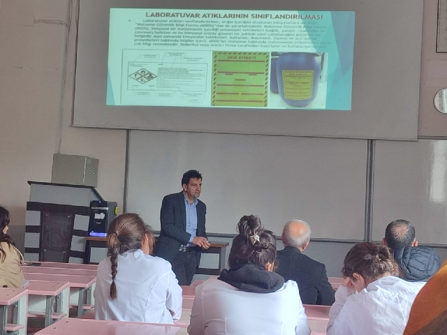 Eğitim, Çevre Yönetimi ve Sıfır Atık Koordinatörlüğü’nden Koordinatör ve Çevre Yüksek Mühendisi Oğuzhan EYİGÜN'ün sunumuyla gerçekleştirildi. Program kapsamında tehlikeli atıkların tanımı, sınıflandırılması, doğru şekilde toplanması, depolanması ve bertaraf edilmesi süreçleri hakkında katılımcılara kapsamlı bilgiler aktarıldı. Ayrıca sıfır atık yaklaşımının önemi vurgulanarak, üniversite bünyesinde sürdürülebilir çevre yönetimi konusunda farkındalık oluşturulması hedeflendi.