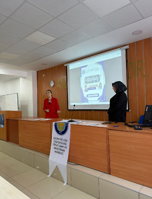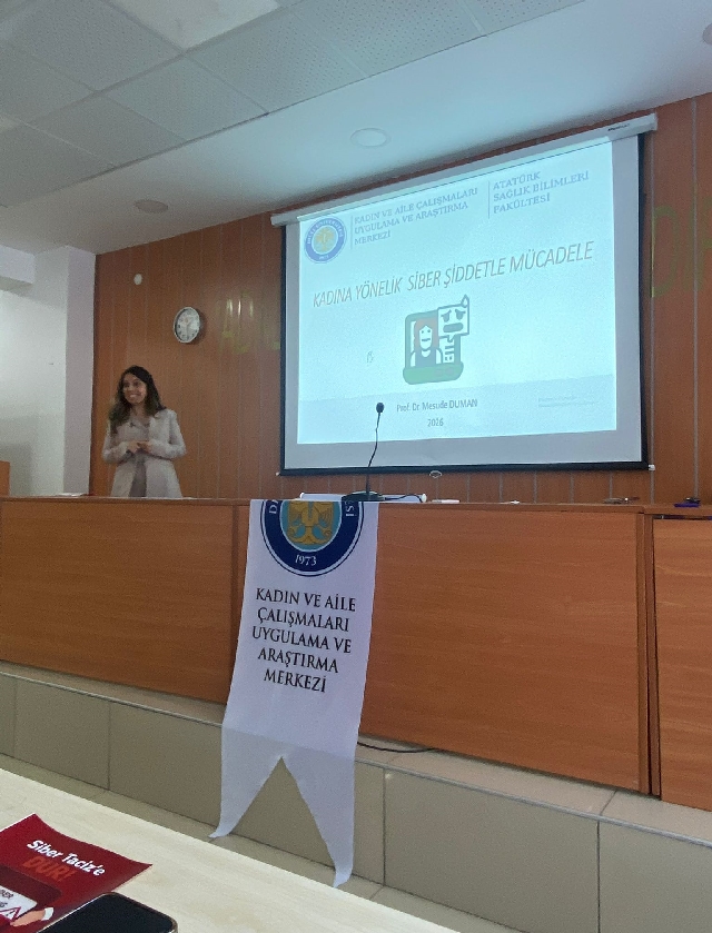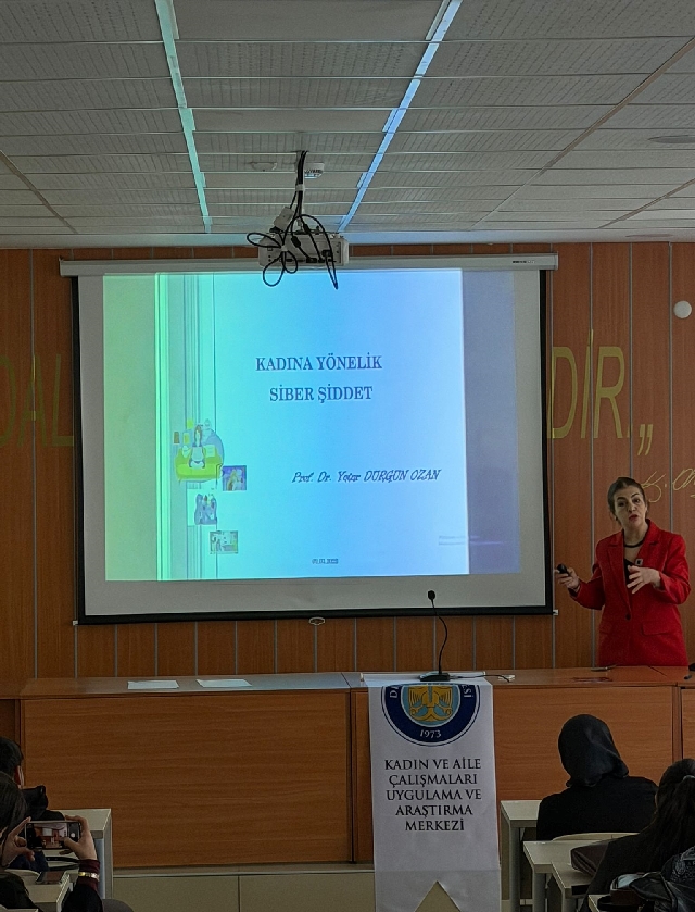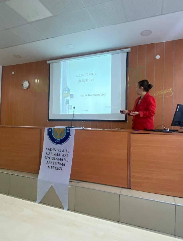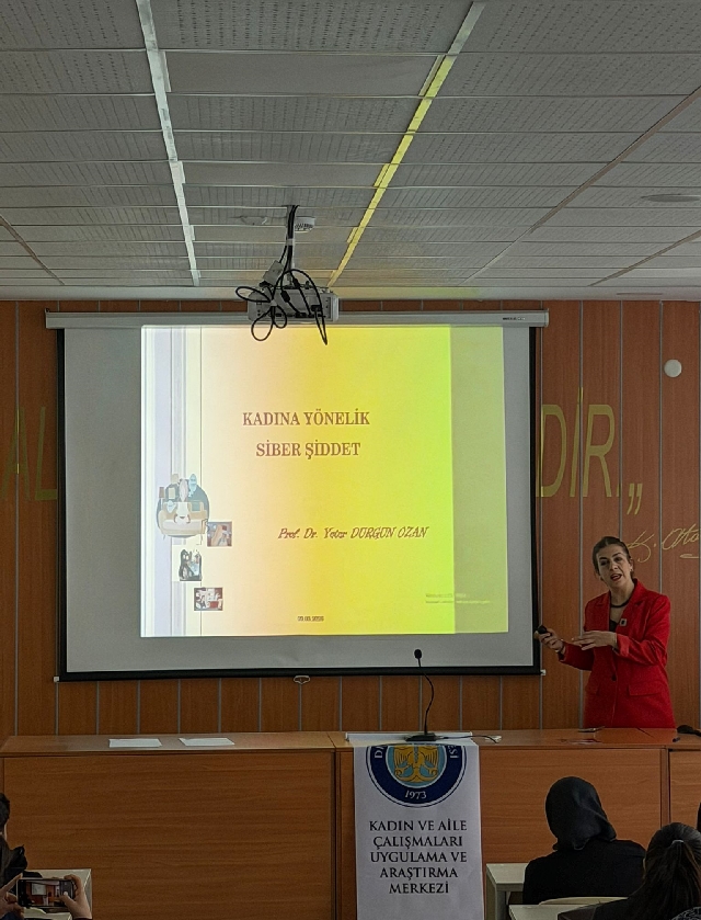 Etkinlikte Prof. Dr. Yeter Durgun Ozan ve Prof. Dr. Mesude Duman, dijital ortamlarda kadınların maruz kaldığı siber şiddet türleri, bu durumun bireysel ve toplumsal etkileri ile mücadele yöntemleri hakkında katılımcılara bilgi verdi.