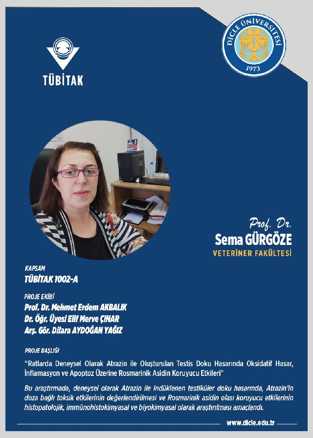 Yürütücülüğünü Prof. Dr. Sema Gürgöze’nin üstlendiği ve Araştırma Görevlisi Dilara Aydoğan Yağız’ın doktora projesi olan “Ratlarda Deneysel Olarak Atrazin ile Oluşturulan Testis Doku Hasarında Oksidatif Hasar, İnflamasyon ve Apoptoz Üzerine Rosmarinik Asidin Koruyucu Etkileri” başlıklı proje, TÜBİTAK 1002-A Hızlı Destek Programı kapsamında desteklenmeye hak kazandı.
