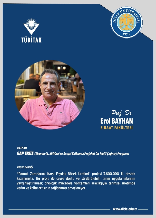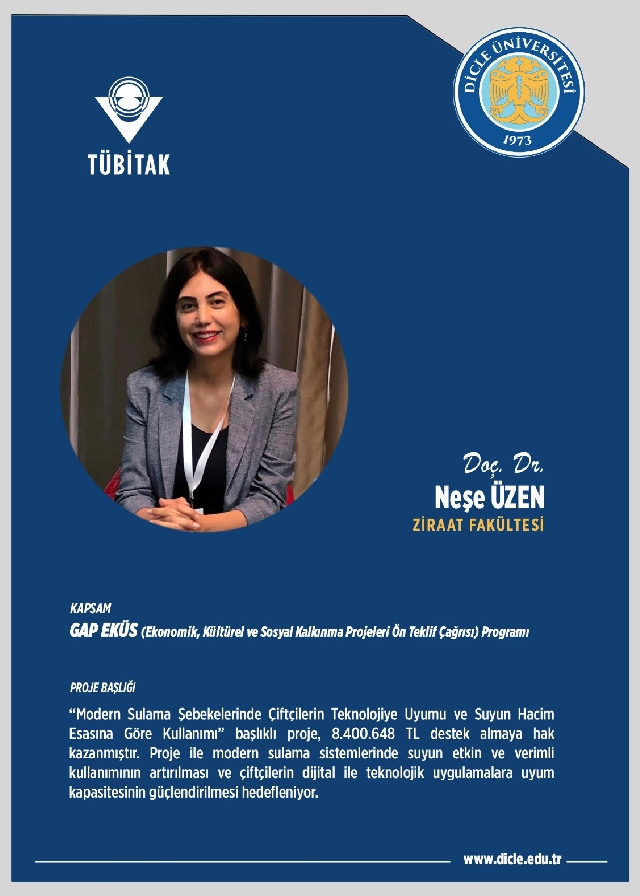Bu kapsamda, “Organik Tarım Kümelenmesi” program önceliği kapsamında Prof. Dr. Erol Bayhan tarafından sunulan “Pamuk Zararlarına Karşı Faydalı Böcek Üretimi” projesi ise 3.600.000 TL destek kazanmıştır. Bu proje ile çevre dostu ve sürdürülebilir tarım uygulamalarının yaygınlaştırılması; biyolojik mücadele yöntemleri aracılığıyla tarımsal üretimde verim ve kalite artışının sağlanması amaçlanıyor. Ayrıca, “Hassas Tarım ve Sürdürülebilir Uygulamaların Yaygınlaştırılması” program önceliği çerçevesinde Doç. Dr. Neşe Üzen Yaman tarafından sunulan “Modern Sulama Şebekelerinde Çiftçilerin Teknolojiye Uyumu ve Suyun Hacim Esasına Göre Kullanımı” başlıklı proje, 8.400.648 TL destek almaya hak kazanmıştır. Proje ile modern sulama sistemlerinde suyun etkin ve verimli kullanımının artırılması ve çiftçilerin dijital ile teknolojik uygulamalara uyum kapasitesinin güçlendirilmesi hedefleniyor.