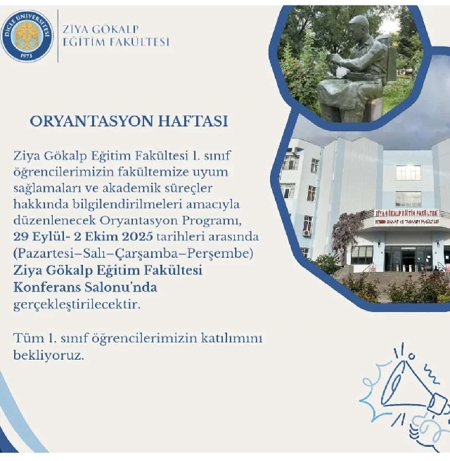 2025-2026 eğitim-öğretim yılında Güzel Sanatlar Eğitimi Bölümü Resim-İş Eğitimi Anabilim Dalı özel yetenek sınavını kazanarak kayıt yaptıran 1. sınıf öğrencilerimizin üniversite yaşamına uyum sağlamalarına destek olmak ve fakültemiz ile bölümümüzü daha yakından tanımalarını sağlamak amacıyla 30 Ekim 2025 tarihinde oryantasyon programı düzenlenecektir.