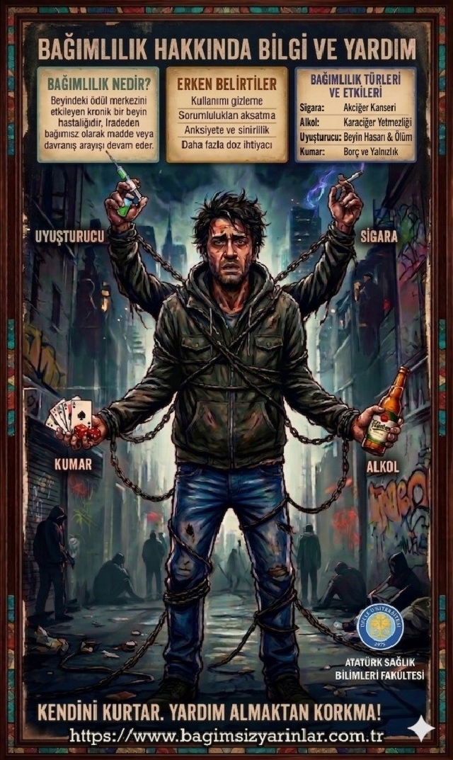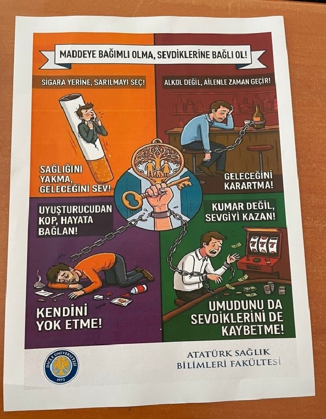 Atatürk Sağlık Bilimleri Fakültesi Hemşirelik Bölümü öğrencileri “Toplumsal Duyarlılık Çalışmaları” dersi kapsamında dersten sorumlu öğretim üyeleri Prof. Dr. Yeter DURGUN OZAN ve Dr. Öğr. Üyesi Esra ANUŞ TOPDEMİR’in danışmanlığında madde bağımlılığı ile ilgili “Bağımsız Yarınlar Etkinliği” gerçekleştirildi. Etkinlik kapsamında farkındalık oluşturmak amacıyla afişler hazırlandı; www.bagimsizyarinlar.com. adlı web sitesi oluşturularak yayına açıldı. Öğrenciler, bu platform üzerinden anonim olarak paylaşımlarda bulunmaktadır.