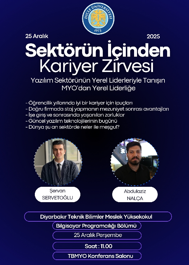 Diyarbakır Teknik Bilimler Meslek Yüksekokulu Bilgisayar Teknolojileri Bölümünün düzenlediği, öğrencilerimize yönelik olarak 25.12.2025 Perşembe Saat 11.00’da “Sektörün İçinden Kariyer Zirvesi” etkinliği başarıyla gerçekleştirilmiştir. Etkinliğimize Üniversitemiz Bilgisayar Programcılığı Bölümümüz mezunlarından Sayın Abdulaziz NALÇA ( Exxe Mobile ) ve Şervan SERVETOĞLU ( KOBIL TEKNOLOJİ ) konuşmacı olacak katılmış olup yazılım dünyasındaki yenilikler, iş fırsatları, yeni trendler ve mezuniyet sonrası başlıkları hakkında sunum yapmışlardır. Değerli konuşmacılarımıza etkinliğimize katıldıkları için teşekkür eder, başarılarının devamını dileriz.
