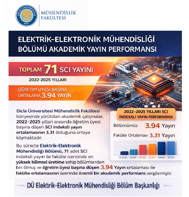 Bu süreçte Elektrik-Elektronik Mühendisliği Bölümü, 71 adet SCI indeksli yayın ile fakülte içerisinde en yüksek bilimsel üretime sahip bölümlerden biri olmuş ve öğretim üyesi başına düşen 3.94 yayın ortalaması ile fakülte ortalamasının üzerinde önemli bir akademik performans sergilemiştir.