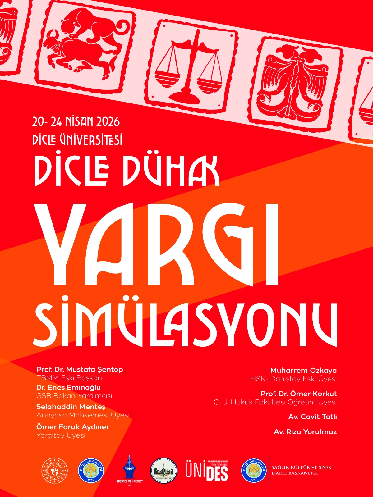 20-24 Nisan 2026 tarihleri arasında düzenlenecek olan "DİCLE DÜHAK YARGI SİMÜLASYONU" hukuk teorisi ile yargı pratiğini bir araya getirmeyi amaçlayan bir etkinlik olup, etkinliğin 20 farklı üniversiteden 140 hukuk öğrencisinin katılımıyla gerçekleştirilmesi planlanmaktadır. Etkinlik yargının işleyişinin konu edinmektedir. Etkinliğe ilişkin afiş ektedir.
