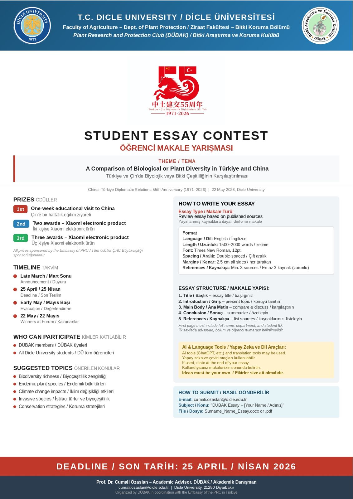 "Çin Halk Cumhuriyeti Ankara Büyükelçiliği sponsorluğunda, Dicle Üniversitesi'nde Öğrenci Makale Yarışması düzenliyoruz! 🏆 1. Ödül: Çin'e eğitim ziyareti. Son başvuru: 25 Nisan 2026. Detaylar afişte.