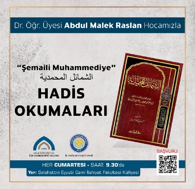 Fakültemiz Dr. Öğr. Üyesi Abdul Malek Raslan tarafından, büyük hadis âlimi Tirmizî’nin eş-Şemâilü’l-Muhammediyye adlı eseri öğrencilerimizle birlikte müzakere edilecektir.