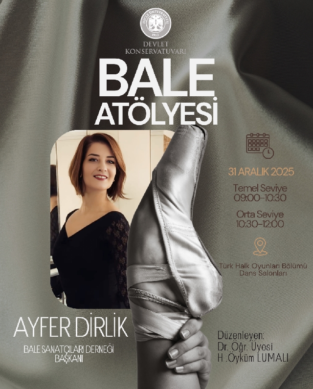 Öğrencilerimizin teknik gelişimleri ve klasik bale tekniğini meslek hayatlarında daha etkili kullanabilmeleri amacıyla, Dr. Öğr. Üyesi H.Öyküm LUMALI tarafından düzenlenecek ve Bale Sanatçıları Derneği Başkanı Sayın Ayfer DİRLİK tarafından yürütülecek olan Temel Seviye ve Orta Seviye Bale Atölyeleri 31 Aralık 2025 Çarşamba günü 09:00 - 12:00 saatleri arasında gerçekleştirilecektir.