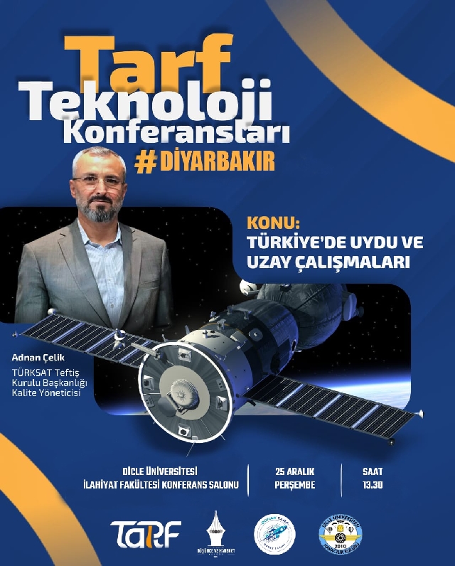 TARF Teknoloji Konferansları kapsamında Diyarbakır’da düzenlenen programda, TÜRKSAT Teftiş Kurulu Başkanlığı Kalite Yöneticisi Adnan Çelik tarafından yapılan sunumda Türkiye’nin uydu ve uzay alanındaki çalışmaları ele alındı.