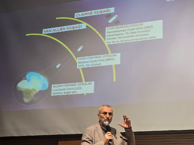Sunumda, Türkiye’nin son yıllarda uzay ve uydu teknolojileri alanında hayata geçirdiği projeler, mevcut kapasitesi ve geleceğe yönelik hedefleri katılımcılarla paylaşıldı. Konferans, öğrenciler tarafından ilgiyle takip edilirken, soru-cevap bölümüyle interaktif bir şekilde tamamlandı.