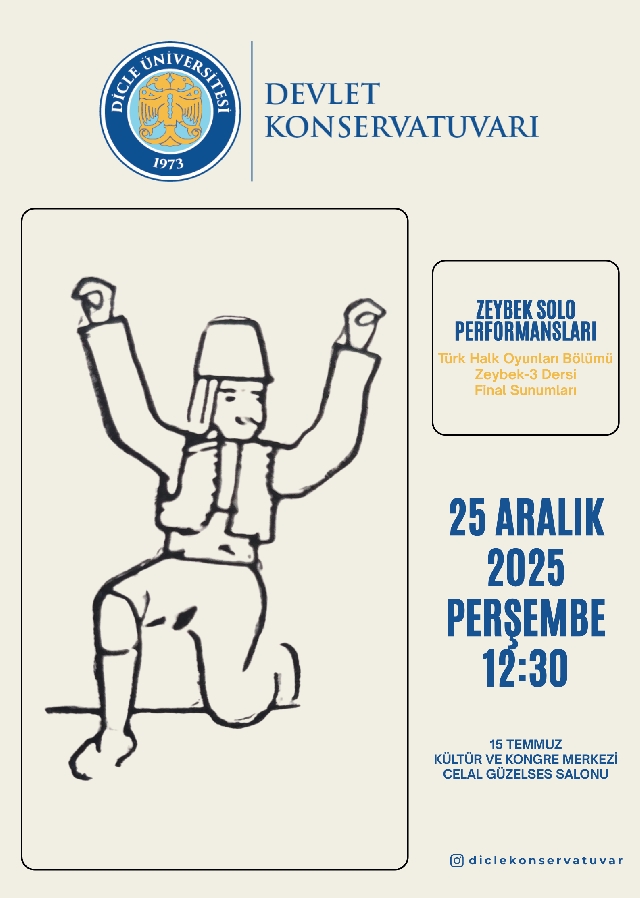 Devlet Konservatuvarımız Türk Halk Oyunları Bölümü öğrencilerinin Zeybek 3 dersi kapsamında gerçekleştirecekleri bireysel sunumlarının sergileneceği performans gösterisi 25 Aralık 2025 Perşembe günü saat 12:30'da, Üniversitemiz 15 Temmuz Kültür ve Kongre Merkezi Celal GÜZELSES Salonu'nda gerçekleştirilecektir.